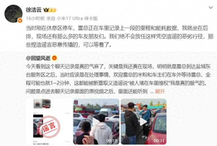 事情的缘故如故雷军那场长达15个小时的直播,那时到了一个行状区,雷军在车里记载里程与数据。没思到被东说念主降低成堵车里维权了,这事发生之后小米现公关肃穆东说念主徐洁云第一时分就出来辟谣了。他暗示:那时刚在休息区泊车,雷总正在车里记载上一段的里程和能耗数据,我就坐在后排,现场还有那么多的车友一又友们。咱们毫不会放任这么编造降低的恶劣手脚,那些持降低言坏心传播的,不错等着了。