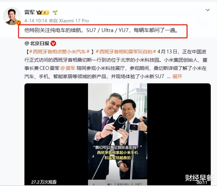 4月13日,桑切斯一瞥到访小米科技园,雷军躬行作陪。首相遴荐试乘一辆绿色YU7,敌手机与车机之间的通顺互动奖饰“这个相配好”。据雷军微博,首相对续航额外关怀,“SU7 / Ultra / YU7,每辆车齐问了一遍”。