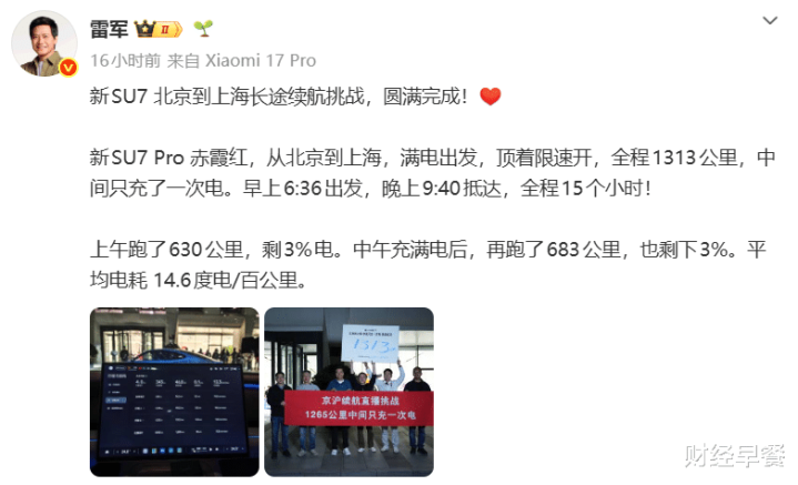 4月17日早上6点半,雷军乘坐一部新SU7 Pro赤霞红,开启北京到上海只充一次电挑战直播,本次挑战将赓续15小时,米兰体育在当晚9:43操纵抵达上海5G将来中心,全程仅充了一次电,挑战得胜!